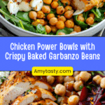 These chicken power bowls with crispy baked garbanzo beans are hearty, protein-packed, and full of fresh flavor. Featuring juicy chicken, crunchy roasted chickpeas, spinach, eggs, pistachios, cranberries, goat cheese, and a zesty lemon-honey vinaigrette, they make a balanced and nourishing meal.