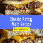 A classic patty melt sandwich made with juicy beef patties, sweet caramelized onions, melted Swiss and cheddar cheese, and crispy buttery rye bread cooked to golden perfection.