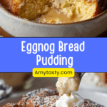 Eggnog Bread Pudding is a cozy, festive dessert made with creamy eggnog custard, warm spices, and tender baked bread, finished with a silky eggnog sauce for pure holiday comfort.