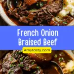 French Onion Braised Beef is a cozy, slow-cooked comfort dish featuring fork-tender beef simmered in a rich, onion-forward broth inspired by classic French onion soup and finished with cheesy gruyere crostini.
