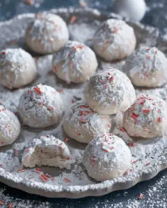In one small bowl, I mix the crushed peppermints with 1/4 cup powdered sugar. In another, I place the remaining 1/4 cup powdered sugar. I roll the warm cookies in the plain powdered sugar first and let them cool completely on a wire rack. Once they’re fully cooled, I roll them again—this time in the peppermint sugar—and sprinkle extra crushed peppermint over the tops.