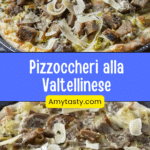 Pizzoccheri alla Valtellinese is a traditional dish from Lombardy’s Valtellina Valley, made with hearty buckwheat pasta, potatoes, cabbage, butter, garlic, and melted alpine cheeses. Creamy, rustic, and deeply comforting, it’s Italian mountain cuisine at its best—rich yet simple, perfect for cozy evenings.