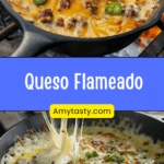 Queso Flameado is a bold, skillet-served Mexican-style melted cheese dish made with bubbling Oaxaca and Monterey Jack cheese, savory grilled meats, roasted peppers, and fresh toppings, perfect for scooping with warm tortillas.