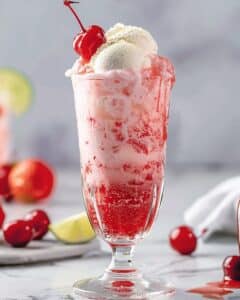 A playful Shirley Temple float made with creamy vanilla ice cream, fizzy lemon-lime soda, and sweet grenadine, finished with festive maraschino cherries for a nostalgic no-fuss dessert drink.