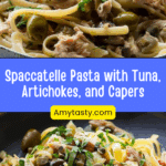 A vibrant Sicilian pasta dish featuring spaccatelle tossed with tuna, artichokes, cherry tomatoes, olives, and capers. This quick and flavorful recipe combines briny Mediterranean ingredients with fresh herbs for a light yet satisfying meal.