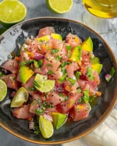 I find this dish is best enjoyed fresh. If needed, I store leftovers in an airtight container in the refrigerator for up to 2 days, but I know the lime juice will continue to break down the tuna over time.